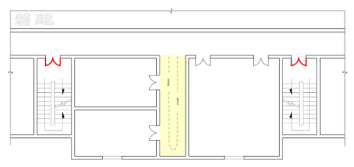 双向疏散走道是指位于两个安全出口之间的走道段。该区域内的房间疏散门具备两个疏散方向,可分别通向不同的安全出口【图示2】,因此现行标准允许的疏散距离较长。在现行标准中,“位于双向疏散走道的房间疏散门”通常表述为“位于两个安全出口之间的房间疏散门”。