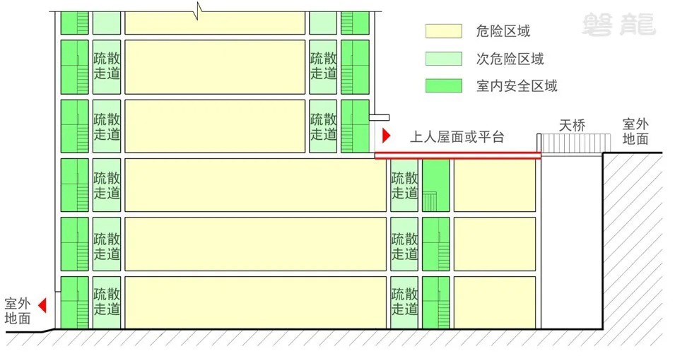 依据安全疏散路径的确立原则,风险只能逐级递减,当上人屋面或平台需要通过疏散楼梯等室内安全区域到达室外地面时,上人屋面和平台只能作为室内安全区域。