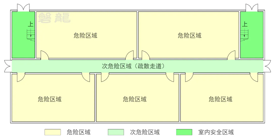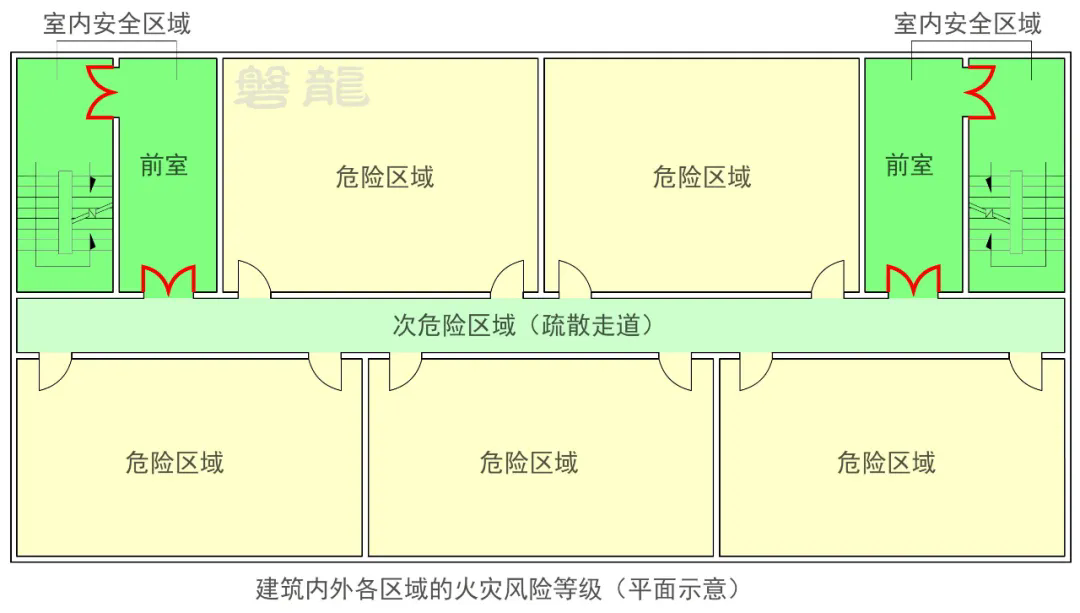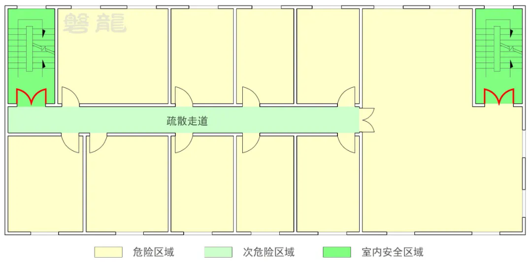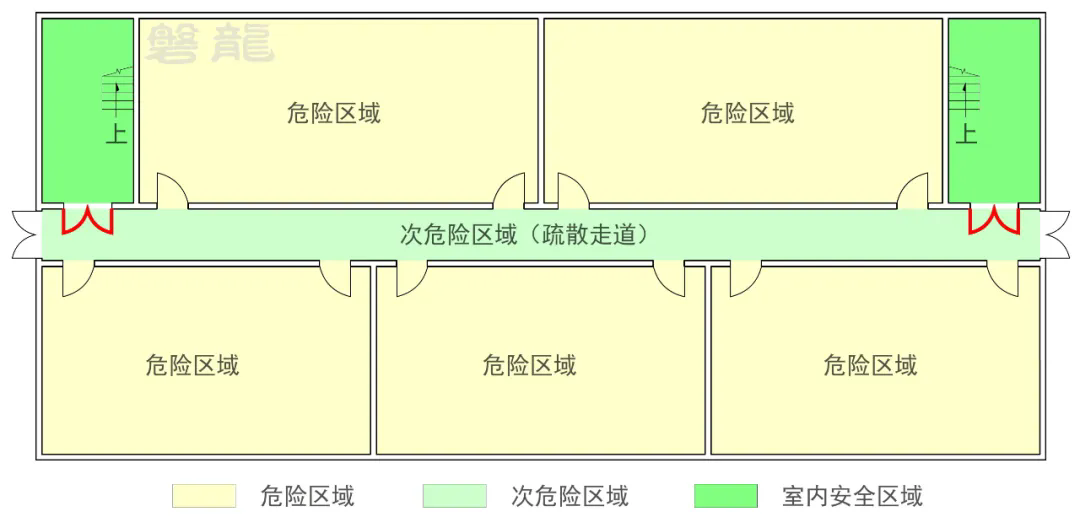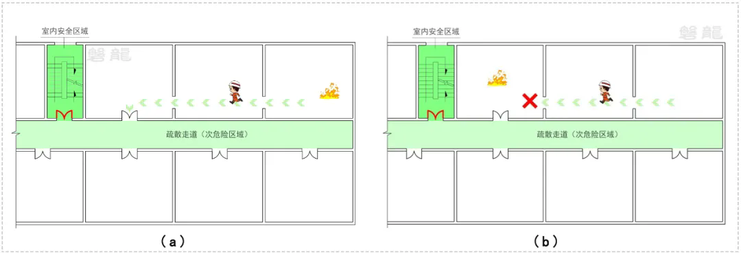 从危险区域疏散至次危险区域,是最常见的安全疏散方式,比如从房间疏散至疏散走道【图示1】。